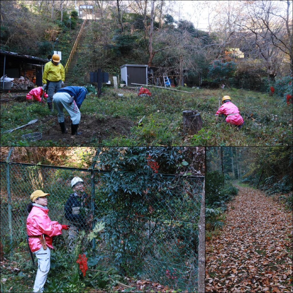 さて、以前あったムクノキが倒れて今ちょっと寂しい状態になっている基地前広場。シンボルツリーになる樹木を植栽しようという提案が菅原会長からあり、森の中にある頃合いの大きさのタムシバをここへ持ってくることになりました。移植の適期にさしかかり、今日は穴掘りを決行。大小様々な岩石を含む土壌と戦いながら、直径約1m、深さ30~50cmほどの穴を掘り上げました。また、その作業と並行して周囲のヤブランを植え替えたり、伸びて見苦しくなったその他の草花を刈り取る作業、増えすぎたナンテンを必要量残しながら伐採する作業などを行いました。タムシバの移植作業は次回以降になりますが、この樹種の根張りの形状上、段階を踏まえた移植が必要で、年明け以降何回かかかる模様です。