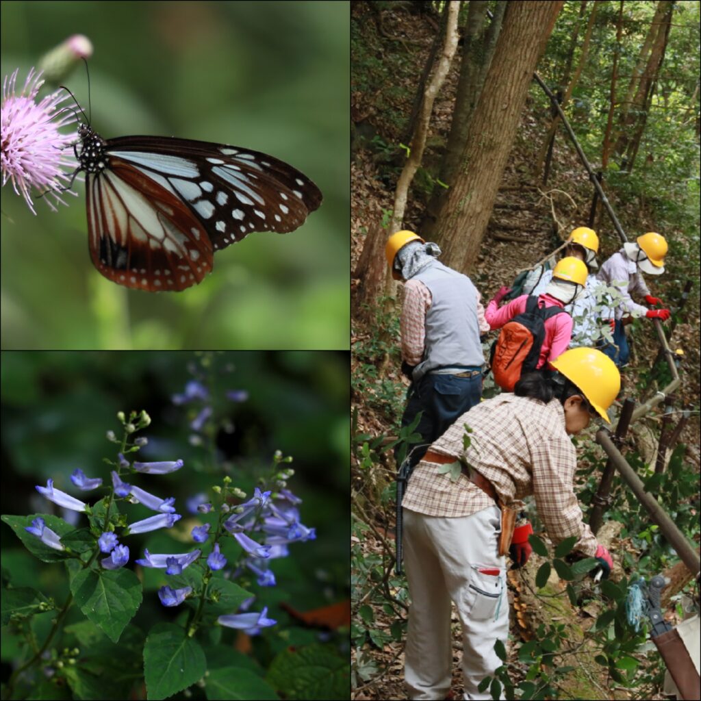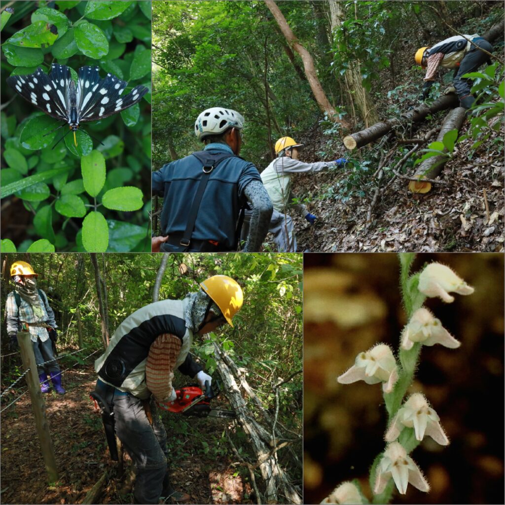 今日は森の中ではゴマダラチョウが葉上の朝露をなめている珍しい光景や(写真左上)、ミヤマウズラという小さなラン科植物の、可憐な花を観察することができました(写真右下)。