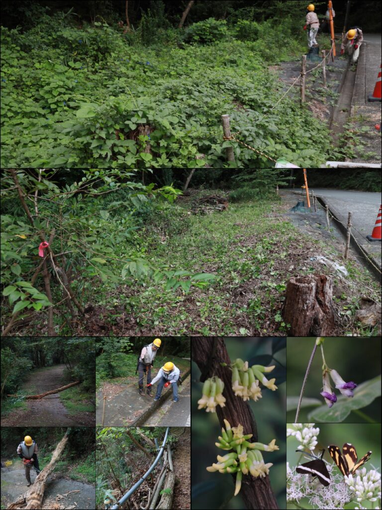 今日は夏の休み前最後の作業日、全員で虫生の森入口周辺の整備に取り組みました。作業前は地面もフェンスも様々な草が伸び放題でしたが(写真上段)、1時間余りの作業できれいさっぱり(写真中段)。フェンスのつる草はほぼ取り除かれ、地面に元々あったヤブランなどの草花が姿を現しました。これからうす紫の涼やかなヤブランの花を楽しめることと思います。つる草を除去されたヒヨドリバナにはまたアサギマダラを呼び集めてほしいものです。なお、写真下段の左は新しい掲示板が加わった入口のようす、右は本部基地前で開花し始めたノリウツギです。