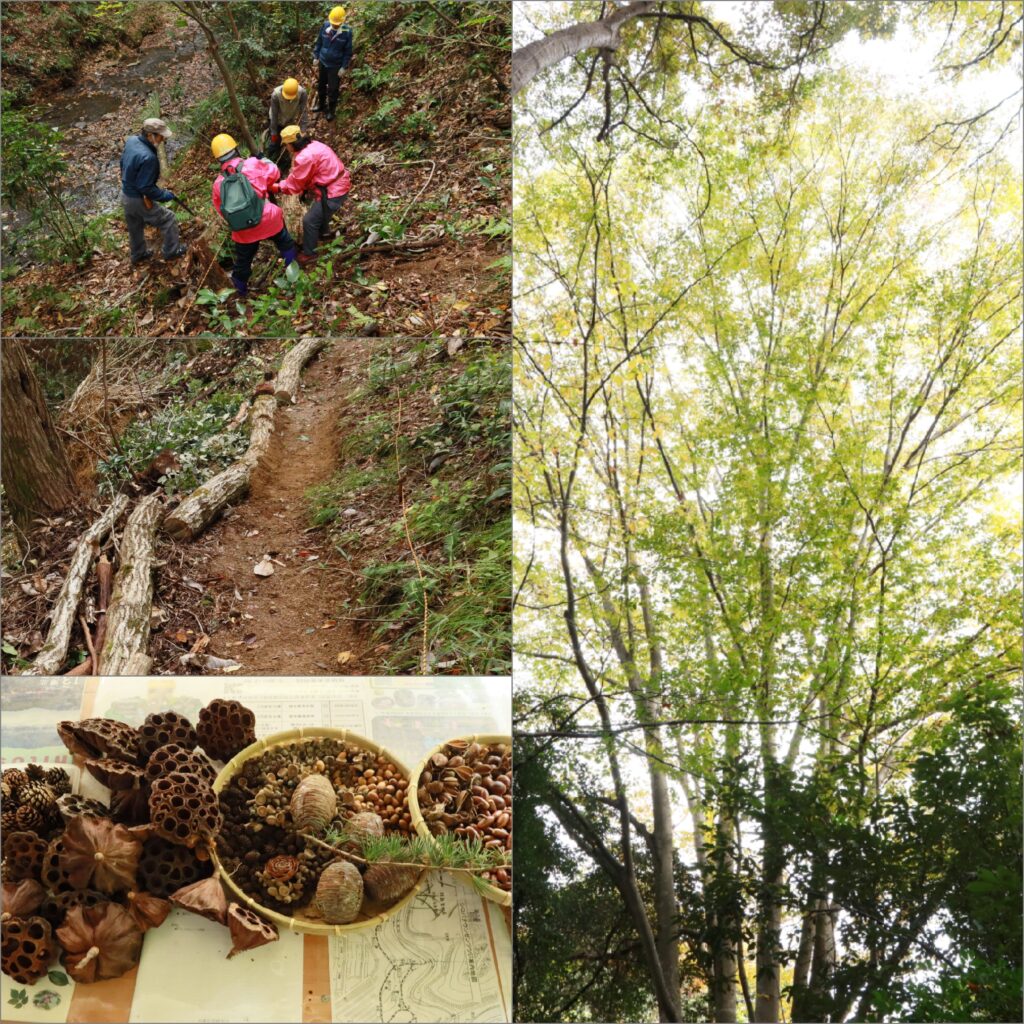 ところで今日の作業地点から虫生川の対岸に、見事な樹形の大きなケヤキがそびえていて、見上げると黄葉した樹冠が朝日を受けて輝いていました。これはきっと今日のご褒美、ありがたく眼福を頂戴しました。左下の写真は、会員がこの近辺で採集した、来週の小学生体験学習で使う工作材料です。いろいろな形がきっと子ども達の制作意欲をかき立ててくれることでしょう。