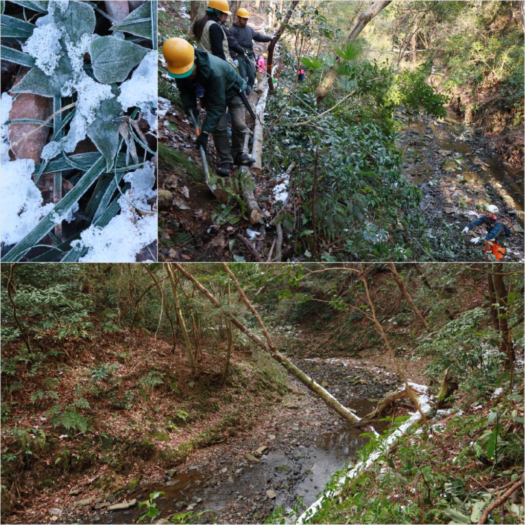 この日は大寒の入り。それらしい厳しい寒さの中、先週の虫生川沿い作業道の整備の続きに取り組みました。まずは道沿いに立てる杭の購入のため、必要な本数を確かめに現地調査。メジャーで実測しながらおおよその杭の位置を定め、本数を確かめました。また、それと並行して道の整備の続き、低木の間引き、伐倒した木々の後処理などを分担して行いました。本部基地前のタムシバ移植用の穴にも更に手が加えられ、ふるいにかけられた粒立ちのそろった土がていねいに穴の底に敷き詰められました。