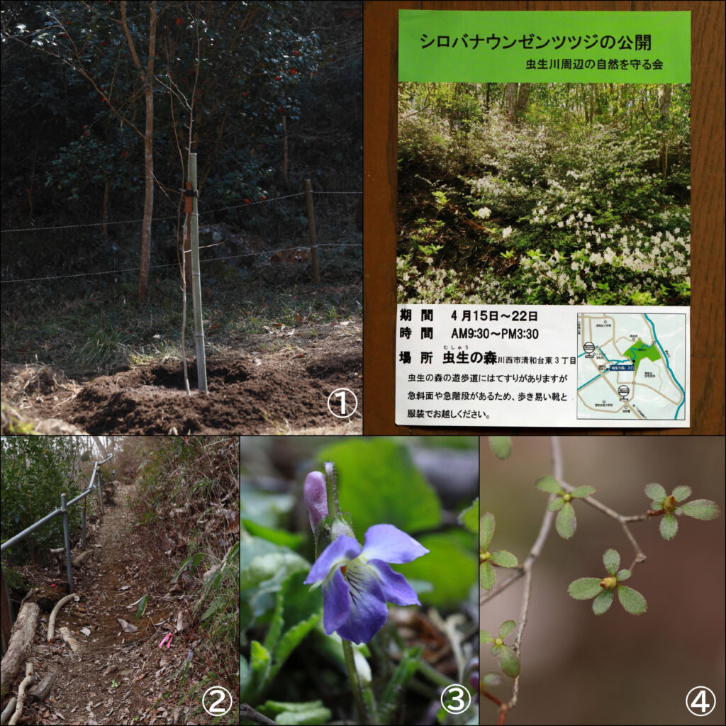 先週の作業日、ツツジの遊歩道の1箇所で陥没があり、今日はその補修工事をしました(写真②)。次回に鋼管数本を追加して補強を行う予定です。また、以前から取り組んでいたタムシバの移植作業がこの日で一応終了(写真①)。今後も見守っていく必要がありますが、無事に活着してくれることを祈るばかりです。そして森の中でも春を告げる花がいよいよ開花開始。基地前広場でアオイスミレが他のスミレ類に先駆け、花幅15ミリにも満たない可憐な花を咲かせていました(写真③)。