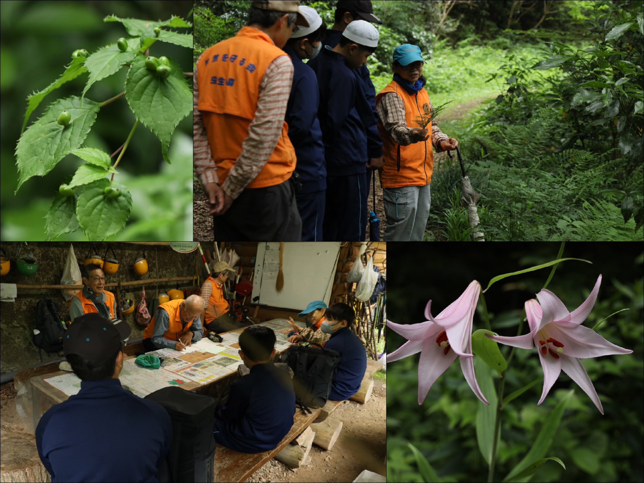 森の中では、朝はまだ蕾だったササユリ(右下)が一斉に開花し始めました。また、エノキやハナイカダ(左上)の実も目に付きました。
