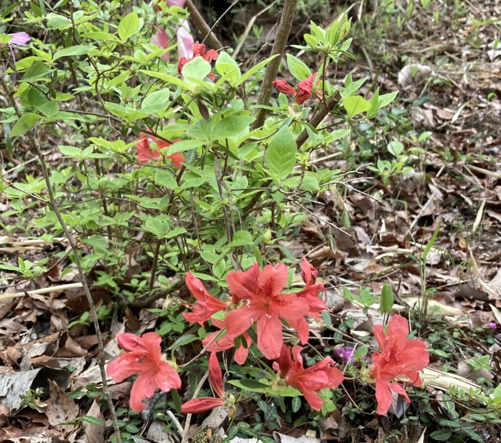 虫生の森では奥の広場に多くあります。ツツジの仲間では開花は遅い方で、シロバナウンゼンツツジ一般公開には花が間に合わないこともあります。画像で奥に咲くピンクの花は、モチツツジ。花期は終わりに近いころです。